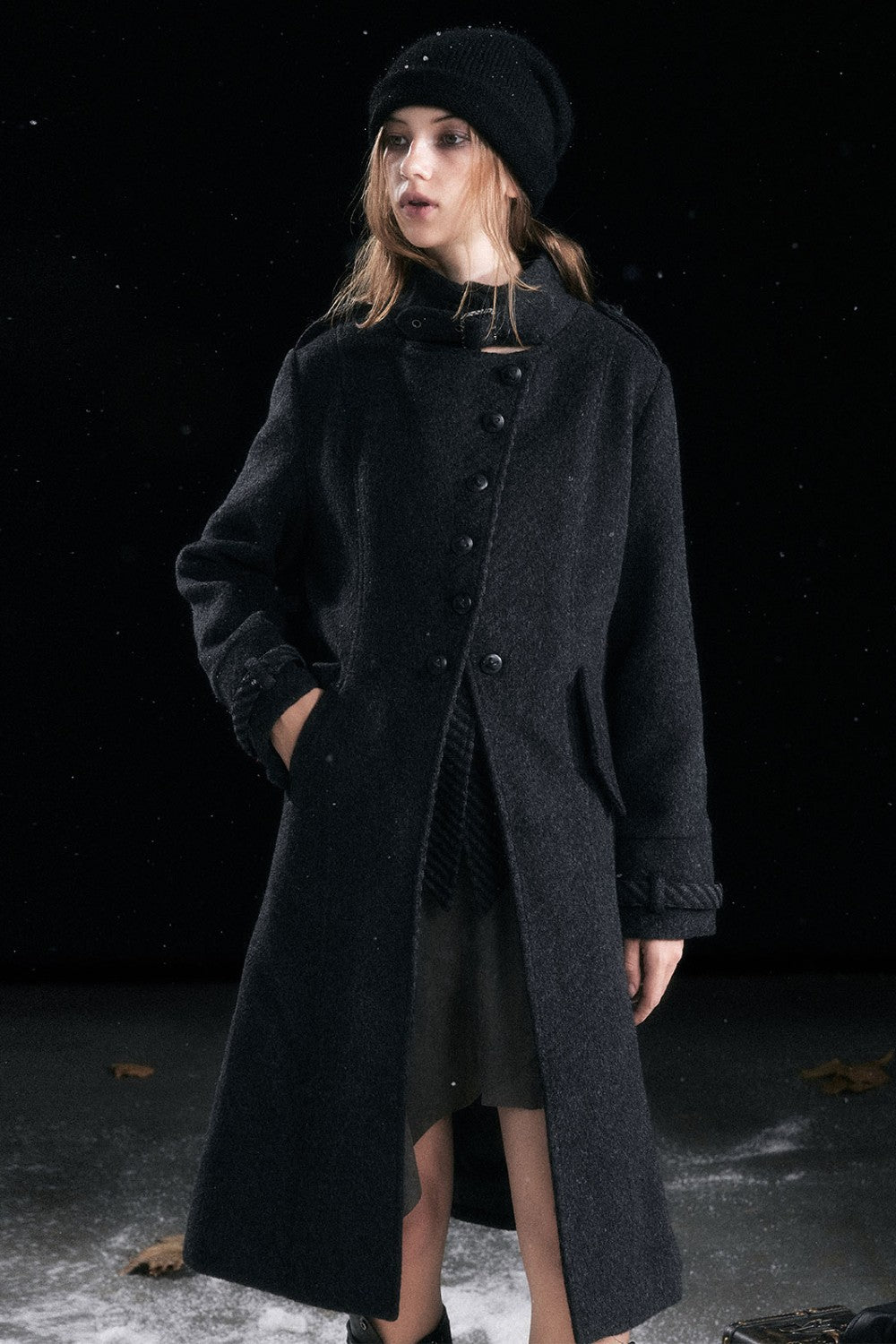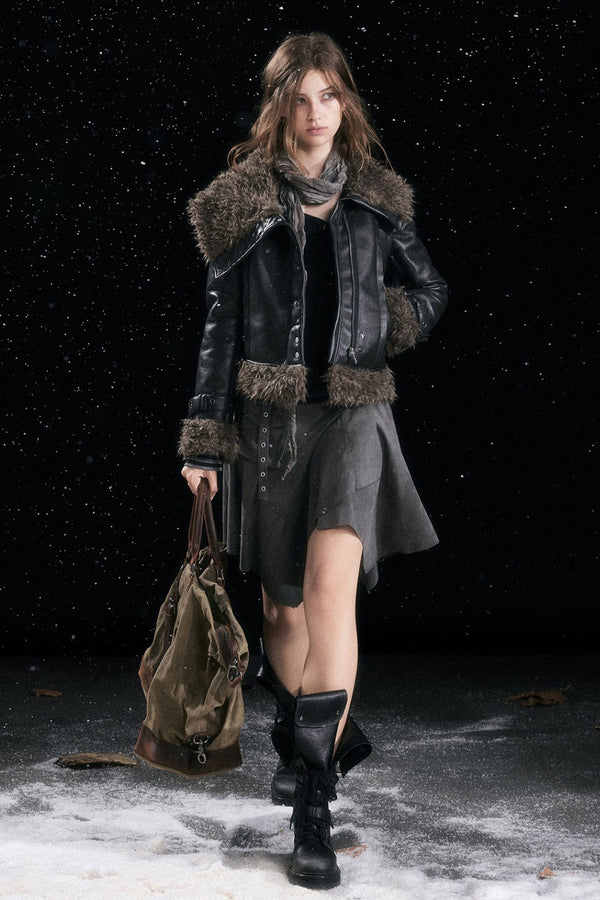 Noir Shearling Coat Asymmetric collar design Fur trimming on collar, hem, and cuffs Studded front...