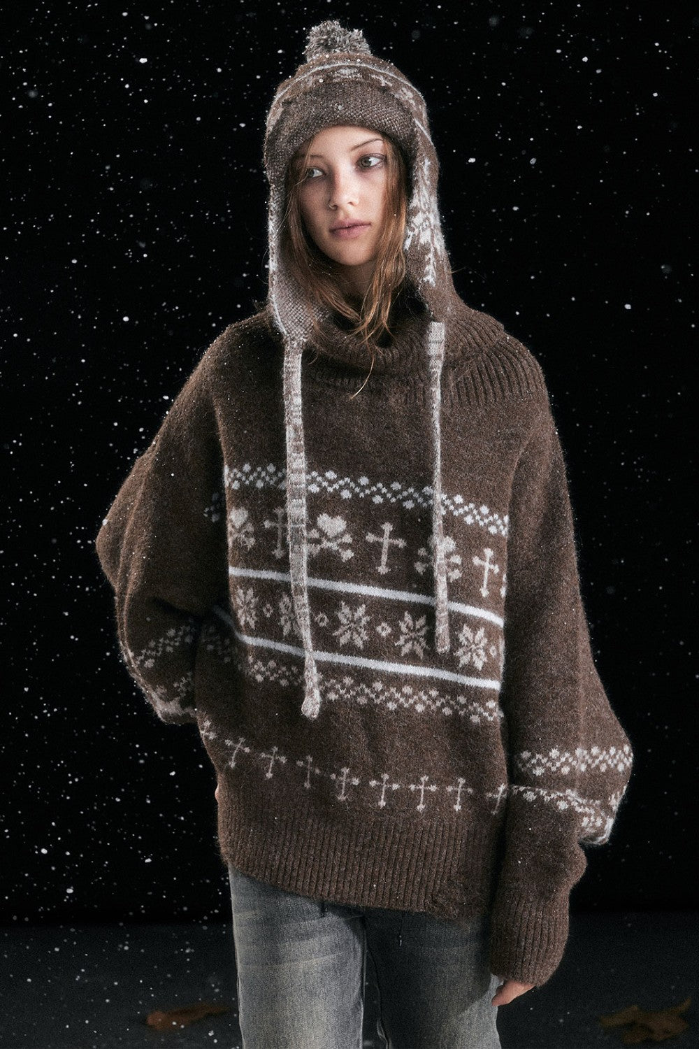 Nori Fair Isle Sweater Off-shoulder foldover collar Cross, floral, and reindeer motifs Oversized design Dropped...
