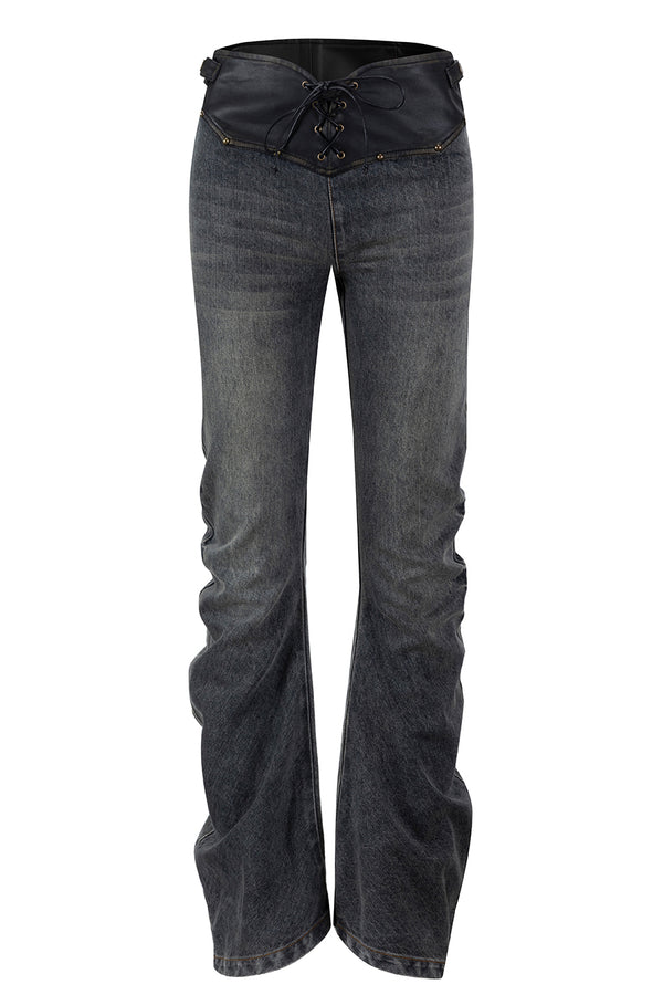 Gia Vintage Blade Jeans Corset waistband panel Leather–denim construction Slight flare Stacked hem effect Rear...