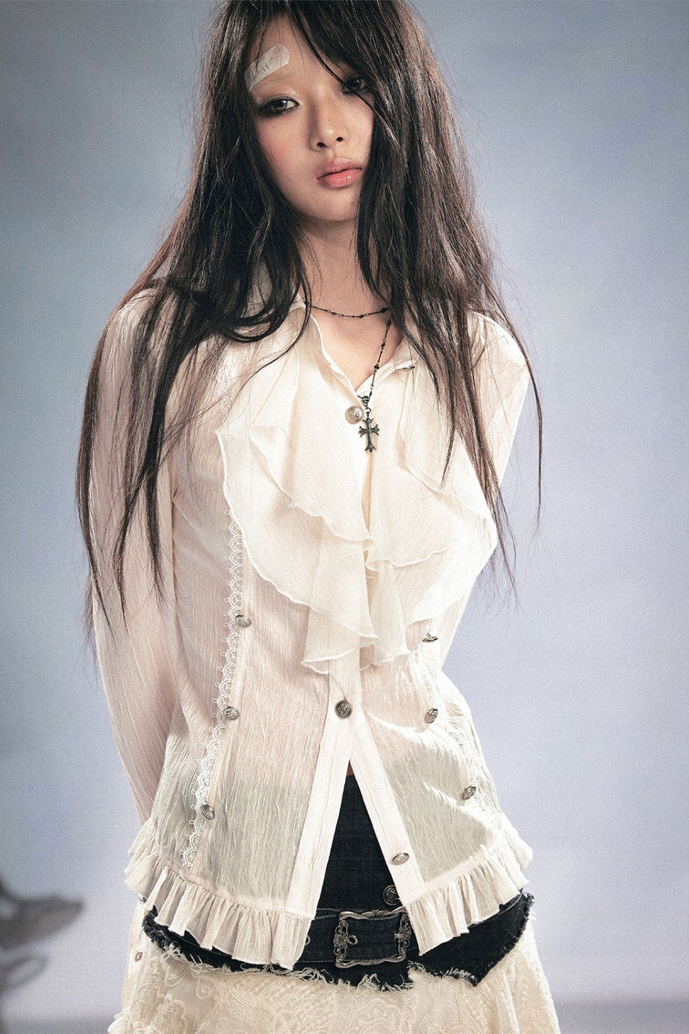 Jennie Lace Panel Blouse Faux two-piece lace panel design Slim fit Soft, breathable feel Button-front...