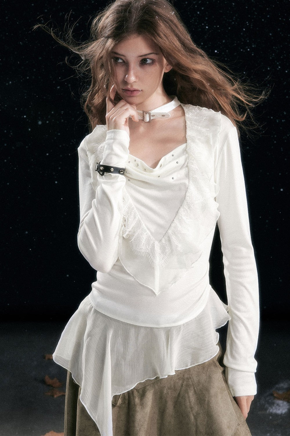 Hooded Drape Layer Shirt Fake two-piece design Draped cowl neckline Vintage distressed texture Adjustable hem...