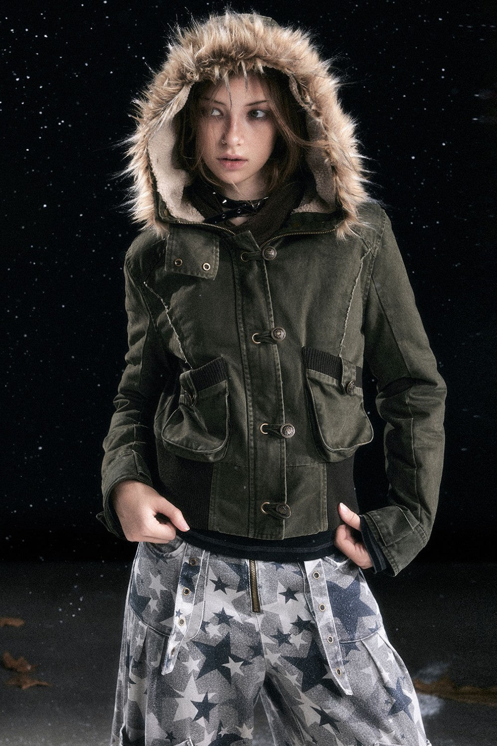 Vintage Army Fur Jacket Plush faux-fur hood trim Straight-fit silhouette Front button closure Large flap...