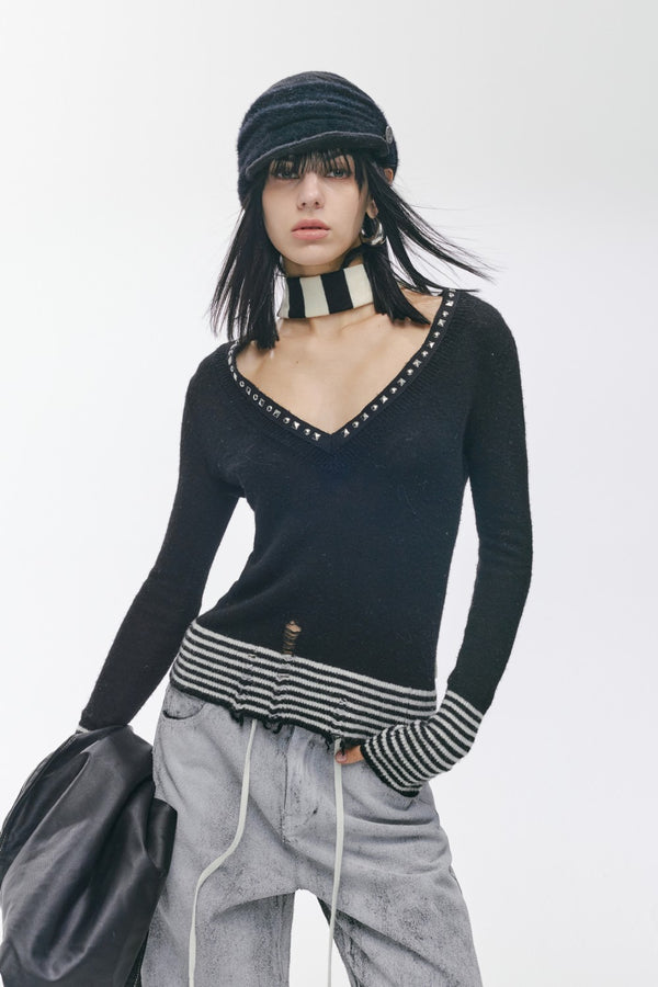 Distressed Rivet V-Neck Shirt Soft knit design Deep V-neckline Studded trim Striped hem & cuffs...