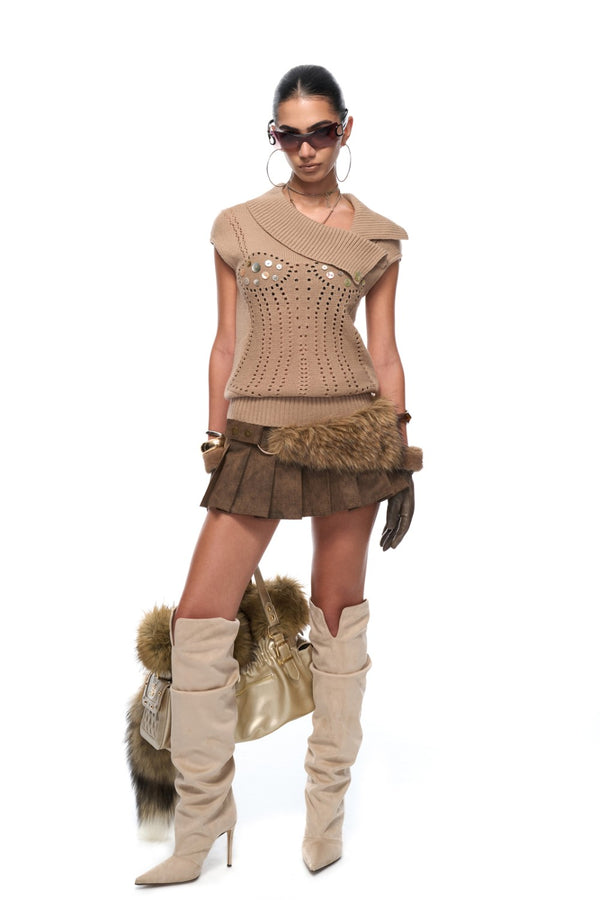 Suede Fur Halter Top Asymmetric halter neckline with faux-fur strap Suede-inspired paneling Subtle shimmer knit...