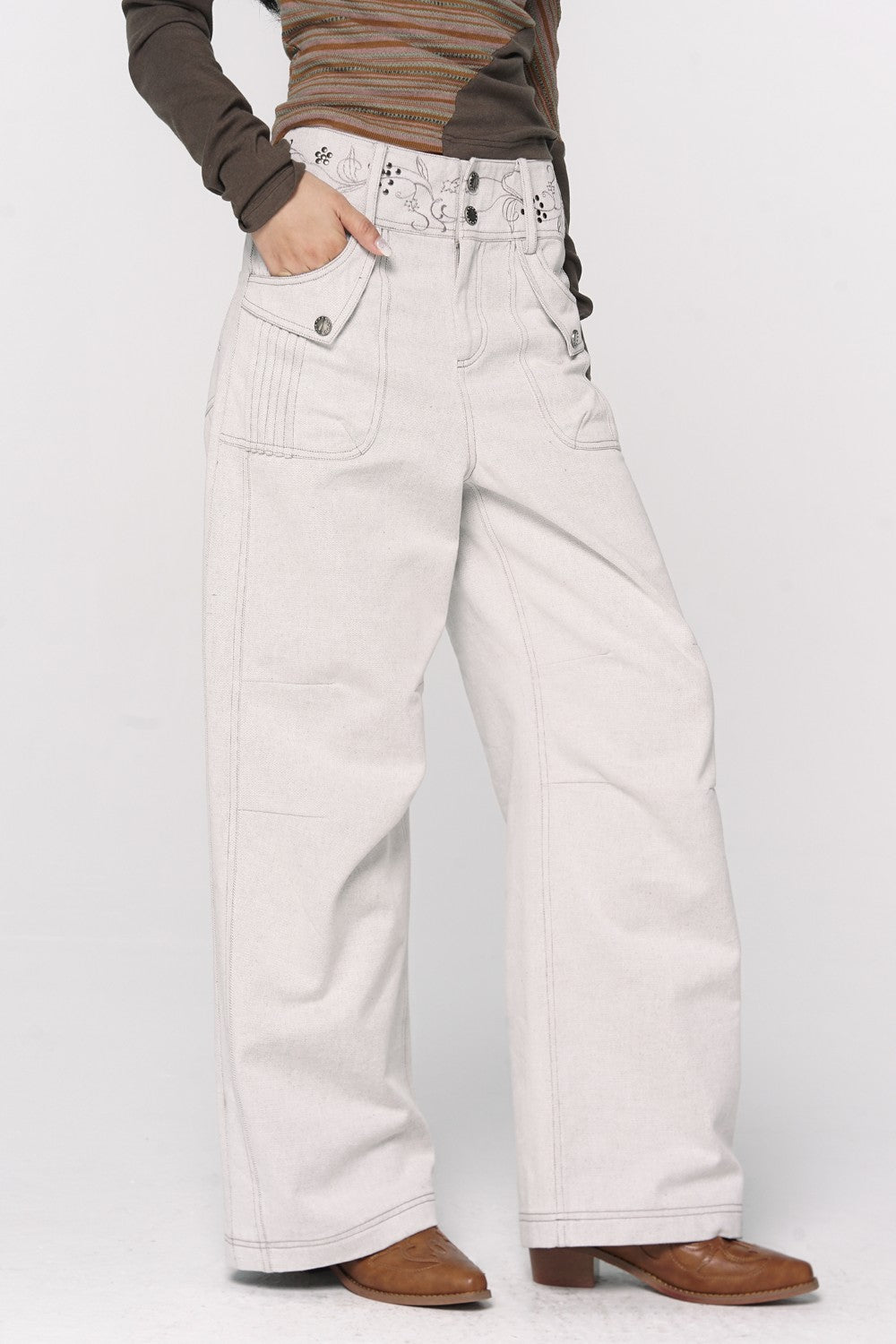 Embroidered Floral Stitch Jeans Wide-leg silhouette Floral embroidery and embellishments on waistband Mid-rise fit Reinforced...