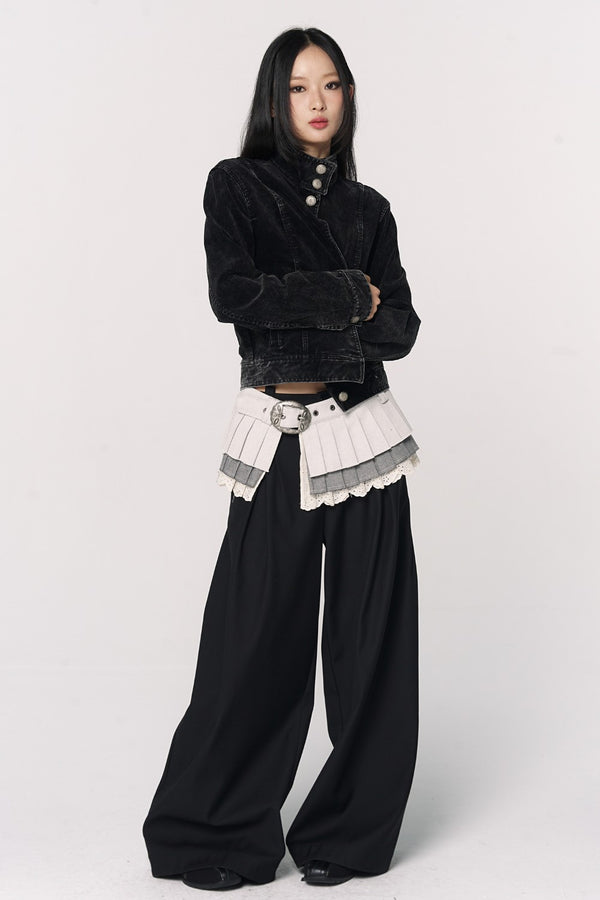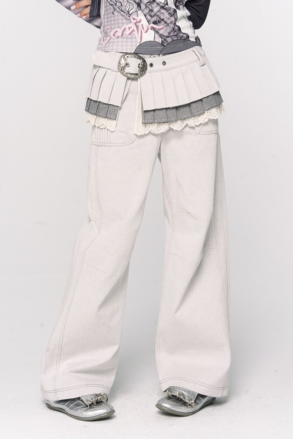 Triple Pleat Overlay Skirt Three-tier pleated overlay Light gray color Lace trim detailing Layered skirt-belt...