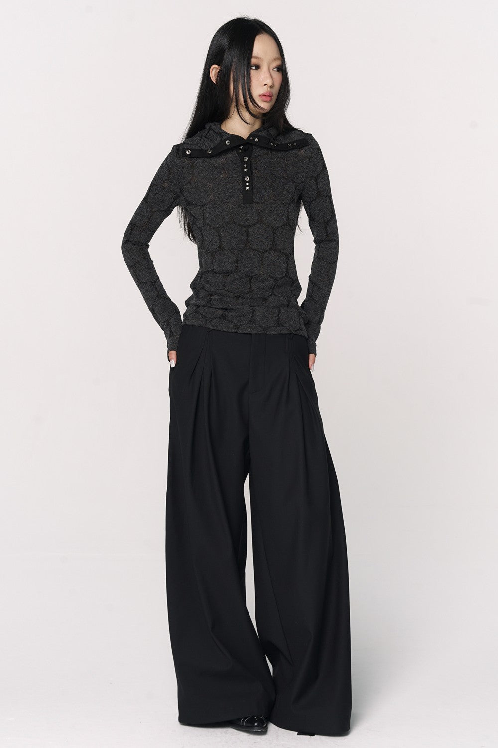 Textured Henley Knit Pullover Soft knit with circular textured pattern Buttoned Henley-style front Stud detailing...