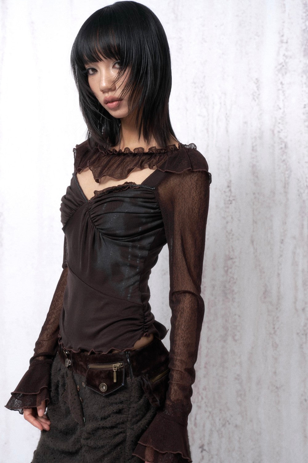 A romantic take on winter grunge. Sheer fabrics, faux-fur trims, and leather pieces come together in deep tones of wine, ash, and cream.
