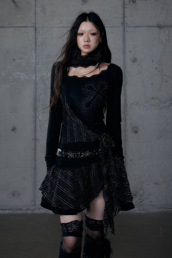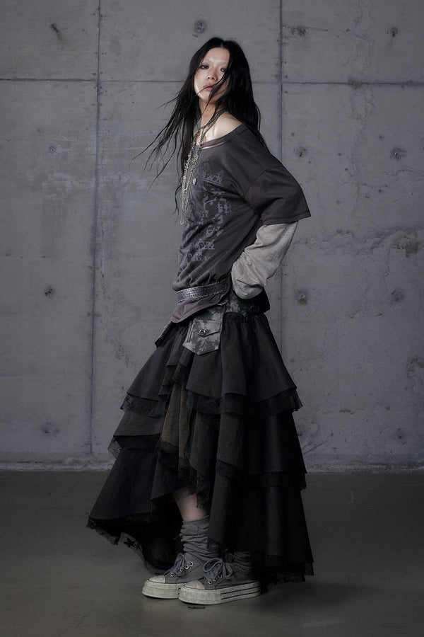 Star Patch Skirt Mid-rise Asymmetrical design Soft plaid base Star-shaped patchwork detail Layered lace panels...