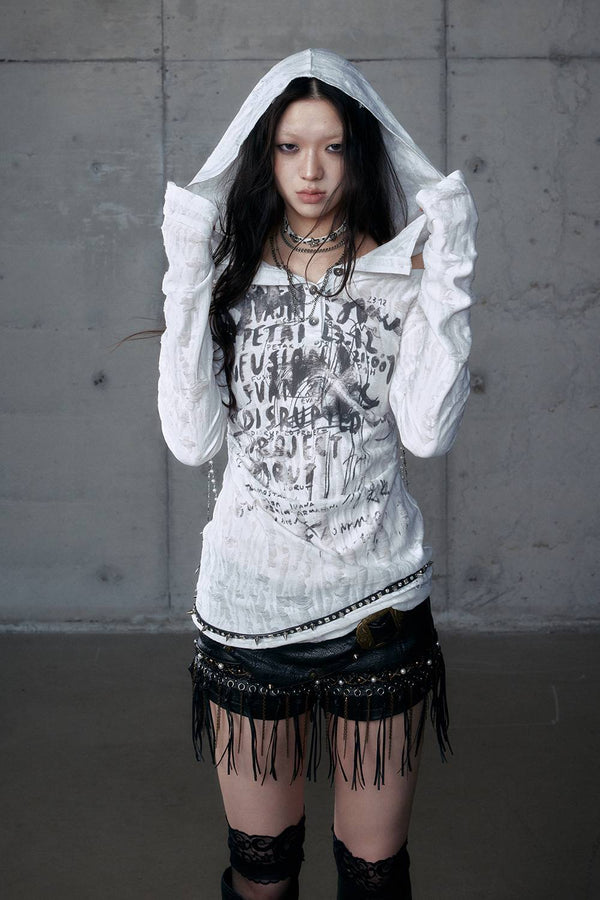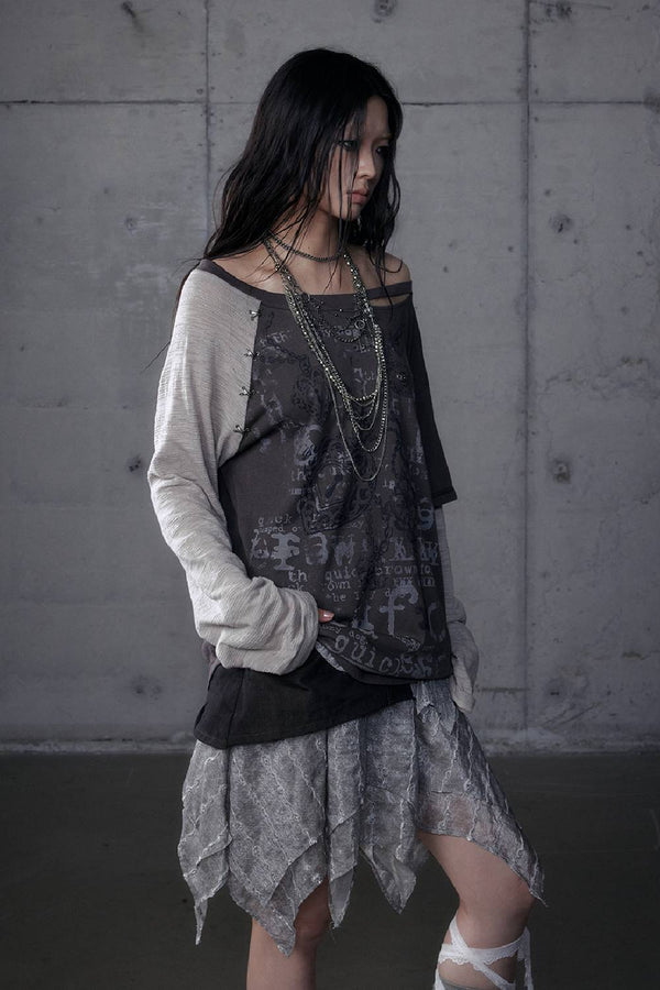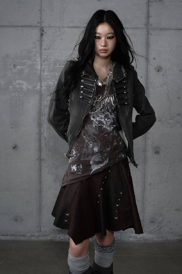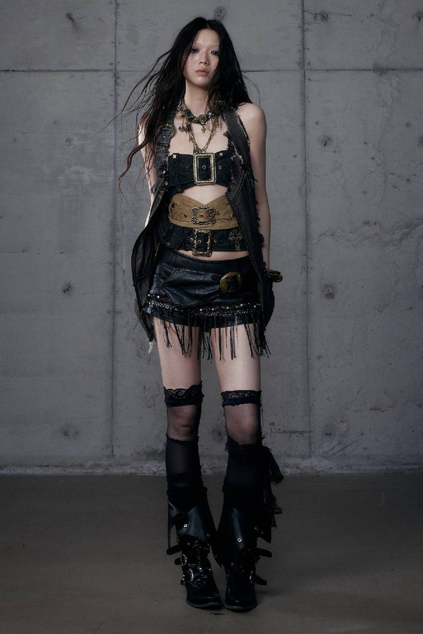 V-Shaped Utility Mini Skirt V-shaped studded strap design Dual cargo-style front pockets Distressed gray denim...