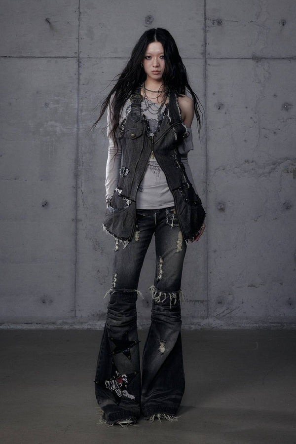 Amber Haze Denim Jeans Washed and distressed finish Wrinkled stacked hem design Slight flare silhouette...