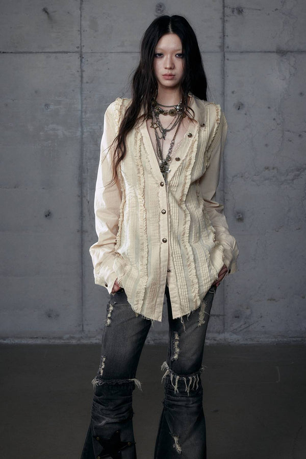 Frayline Ruffle Denim Shorts Washed denim Frayed hem Low-rise cut with fitted silhouette Layered button-front...