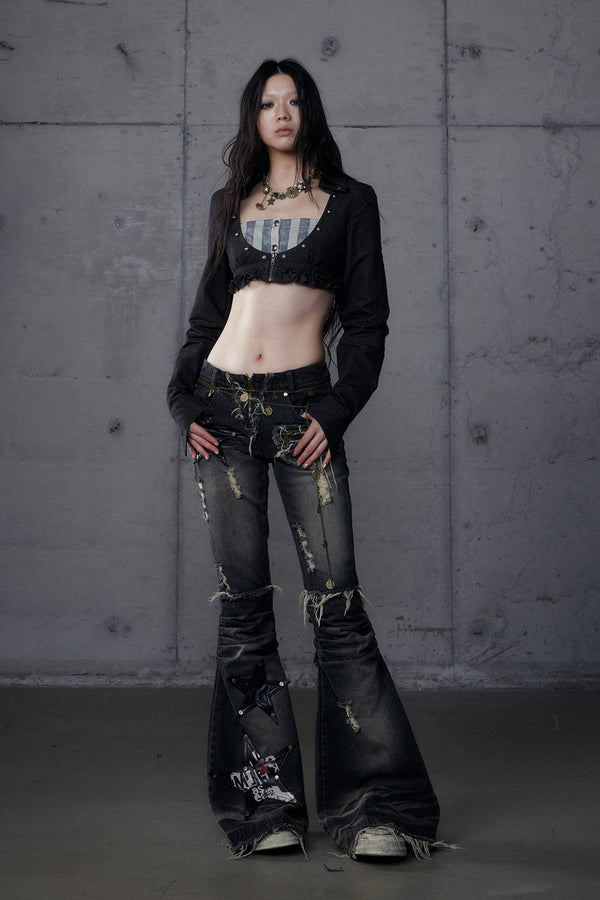 Dual Waist Rhinestone Jeans Flared silhouette Dual waistband detail Plaid contrast panels Rhinestone design on...