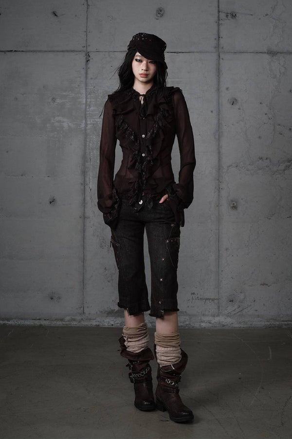 Lace Ruffle Corset Blouse Lightweight lace blouse Slim-fit silhouette Double-layer collar Ruffle trim Lace-up front...