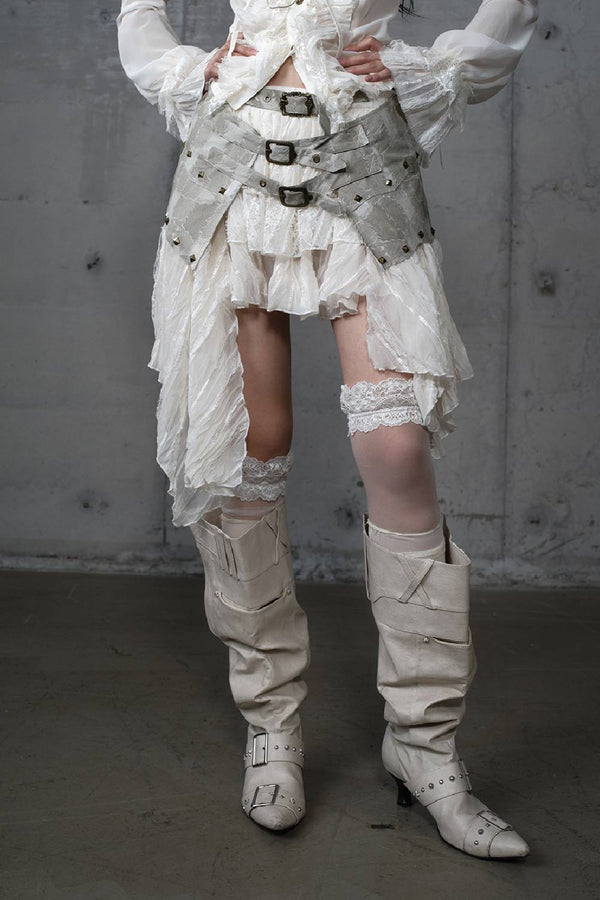 Freya Belted Denim Skirt Paneled skirt Distressed washed denim Layered leather belts and buckles Adjustable...