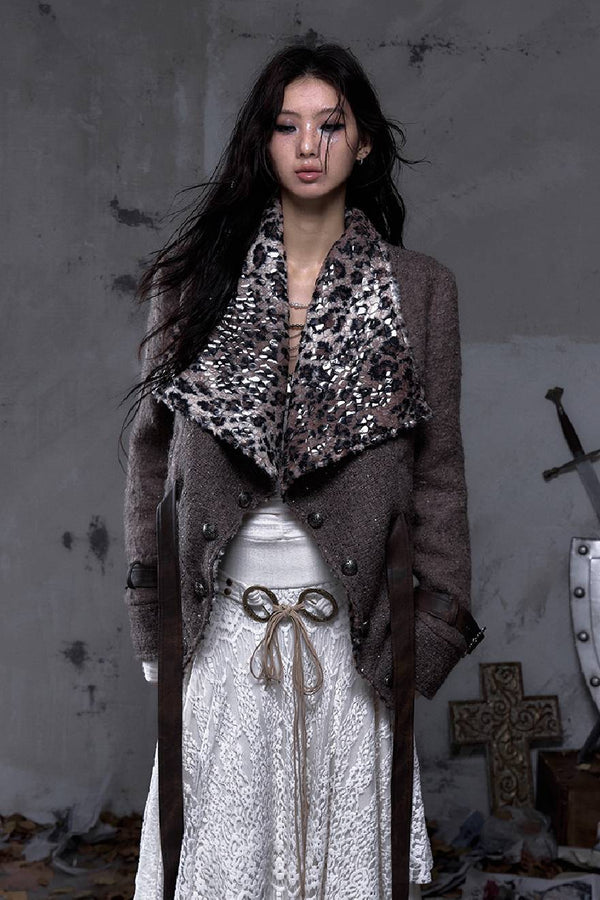 Feral Curve Drape Shirt Draped neckline front Flared long sleeves Layered leopard hem Adjustable waist...